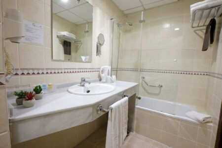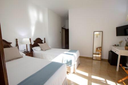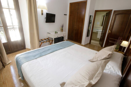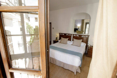 Nuestras habitaciones dobles, con cama de matrimonio o dos camas individuales, están pensadas para ofrecer descanso y funcionalidad. Todas cuentan con aire acondicionado, wifi gratuito y caja fuerte, y muchas de ellas se abren al patio cordobés o al exterior.