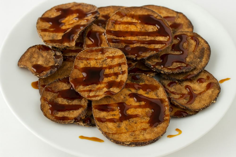 Berenjenas rebozadas y fritas, servidas con un toque de miel de caña.