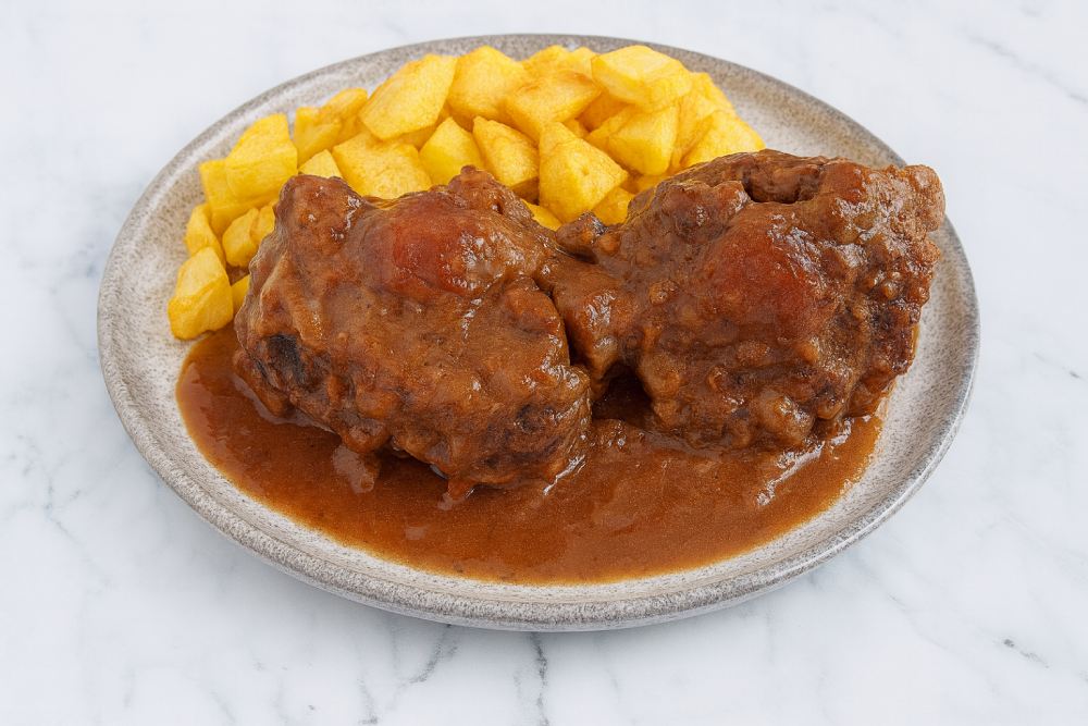 Guiso tradicional cocinado a fuego lento con vino tinto y verduras, hasta que la carne queda muy tierna.
