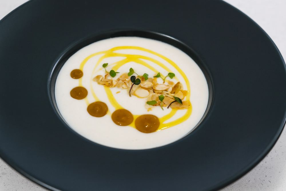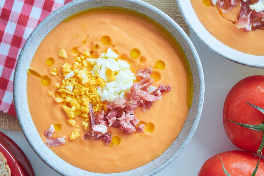 Crema fría de tomate, pan, aceite de oliva virgen extra y ajo, servida bien espesa y normalmente coronada con huevo duro y taquitos de jamón.
